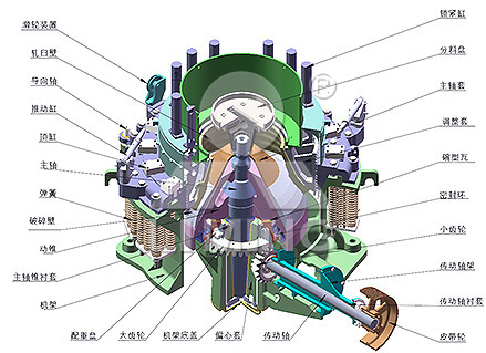 工作時(shí),由電動(dòng)機(jī)通過三角帶、大帶輪、傳動(dòng)軸、小錐齒輪、大錐齒輪帶動(dòng)偏心套旋轉(zhuǎn),破碎圓錐軸心線在偏心軸套的迫動(dòng)下做旋轉(zhuǎn)擺動(dòng),使得破碎壁表面時(shí)而靠近又時(shí)而離開軋臼壁的表面,從而使物料在定錐與動(dòng)錐組成的環(huán)形破碎腔內(nèi)不斷地受到?jīng)_擊、擠壓和彎曲而破碎。經(jīng)過多次擠壓、沖擊和彎曲后,物料破碎至要求粒度經(jīng)下部排出。